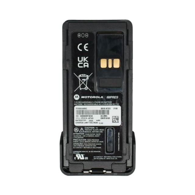 The PMNN4489C IMPRES Li-Ion 2900mAh UL-TIA4950 Battery is a high-performance power solution designed with advanced IMPRES technology. This battery delivers optimal performance and extended battery life. It is certified with UL-TIA4950 and features an IP68 submersible rating.